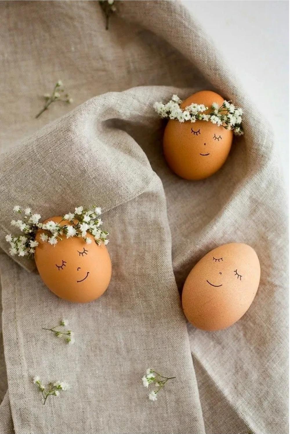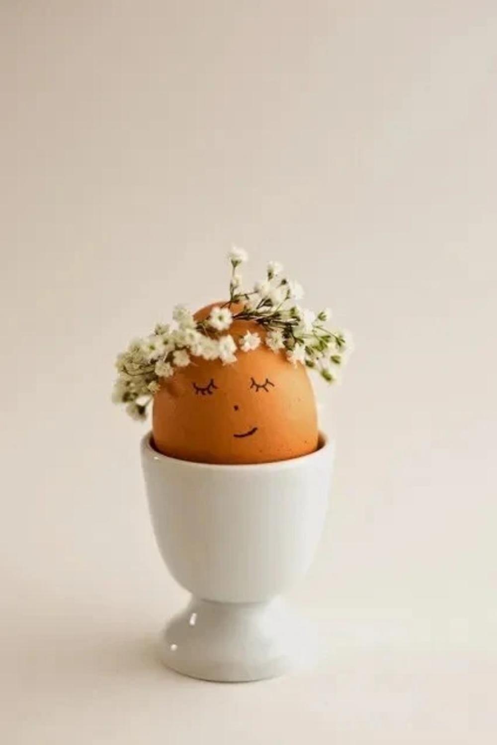 Na kraju možete dodati malo karaktera — nacrtajte jednostavno lice na jajetu: oči, nos i blagi osmijeh. Stavite vijenac i postavite jaje u stalak.