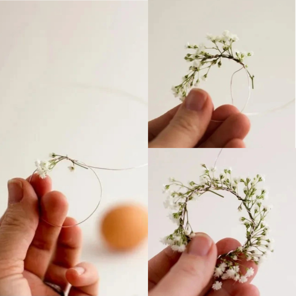 Sada dolazi najljepši dio. Postepeno pričvršćujte male cvjetiće na osnovu pomoću druge žice. Ne žurite — dodajte detalje onako kako vam se sviđa. U jednom trenutku vijenac će se “posložiti” i dobiti lijep, skladan oblik. Kada završite, sakrijte kraj žice ispod cvijeća.