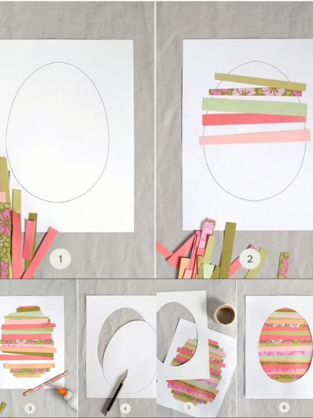 Sada složite osnovu: rasporedite trake, isprobajte različite kombinacije, pa ih zalijepite. Nakon toga, pažljivo izrežite otvor u obliku jajeta na drugom listu (ovaj dio je bolje da uradi odrasla osoba). Kada je okvir spreman, postavite ga preko traka i zalijepite.