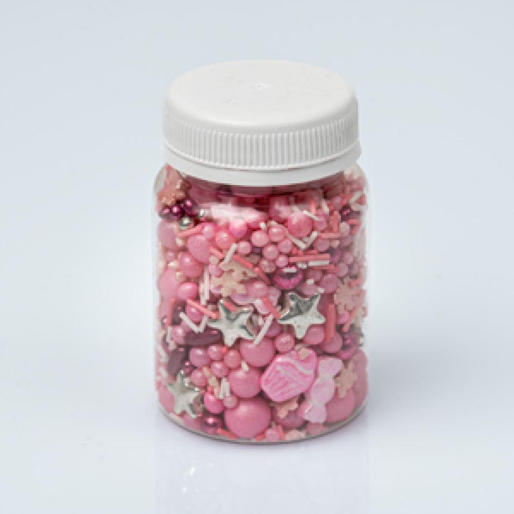 Kombinacija rozih, srebrnih i bijelih šećernih perlica raznih veličina i oblika.