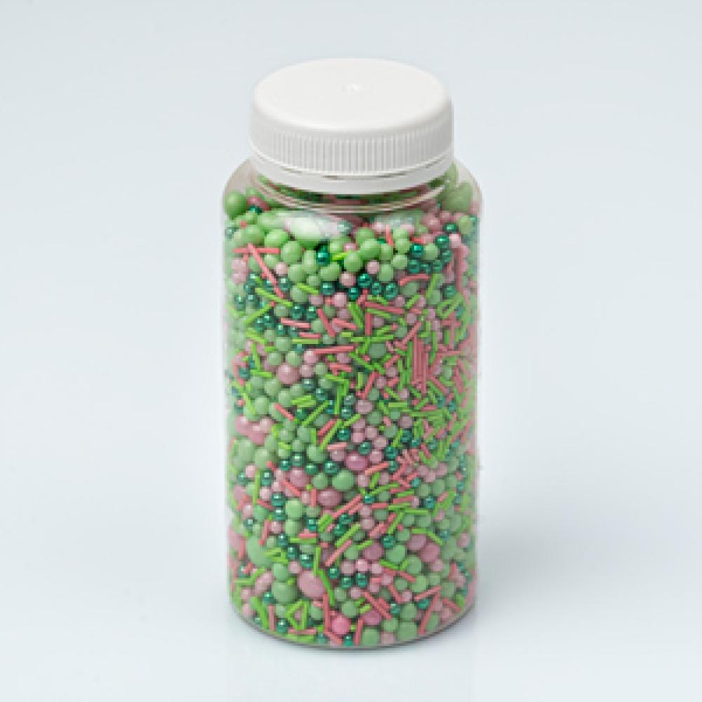 Kombinacija zelenih i rozih šećernih perlica raznih veličina i oblika.