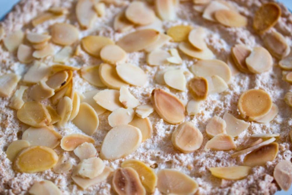 Bjelance umutiti sa šećerom do čvrste teksture. Sve suve sastojke sjediniti. Pažljivo promješati zajedno umućeno bjelance i ostale sastojke. Ispeći na temperaturi 175 C oko 10-12 min.