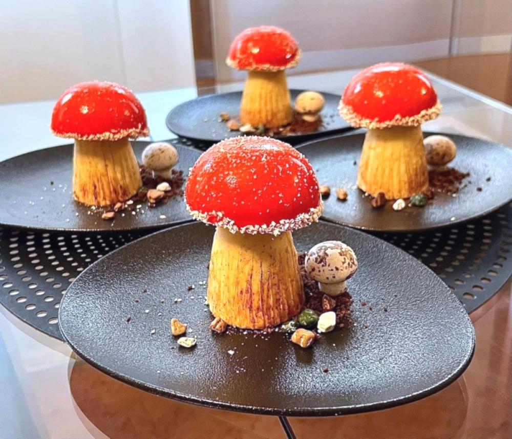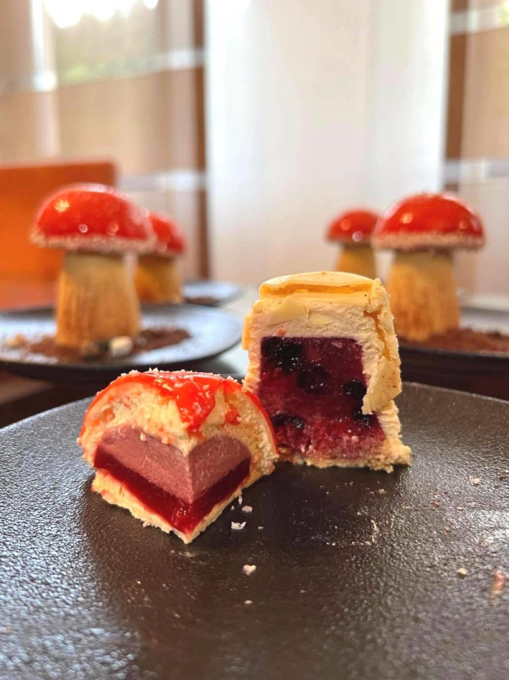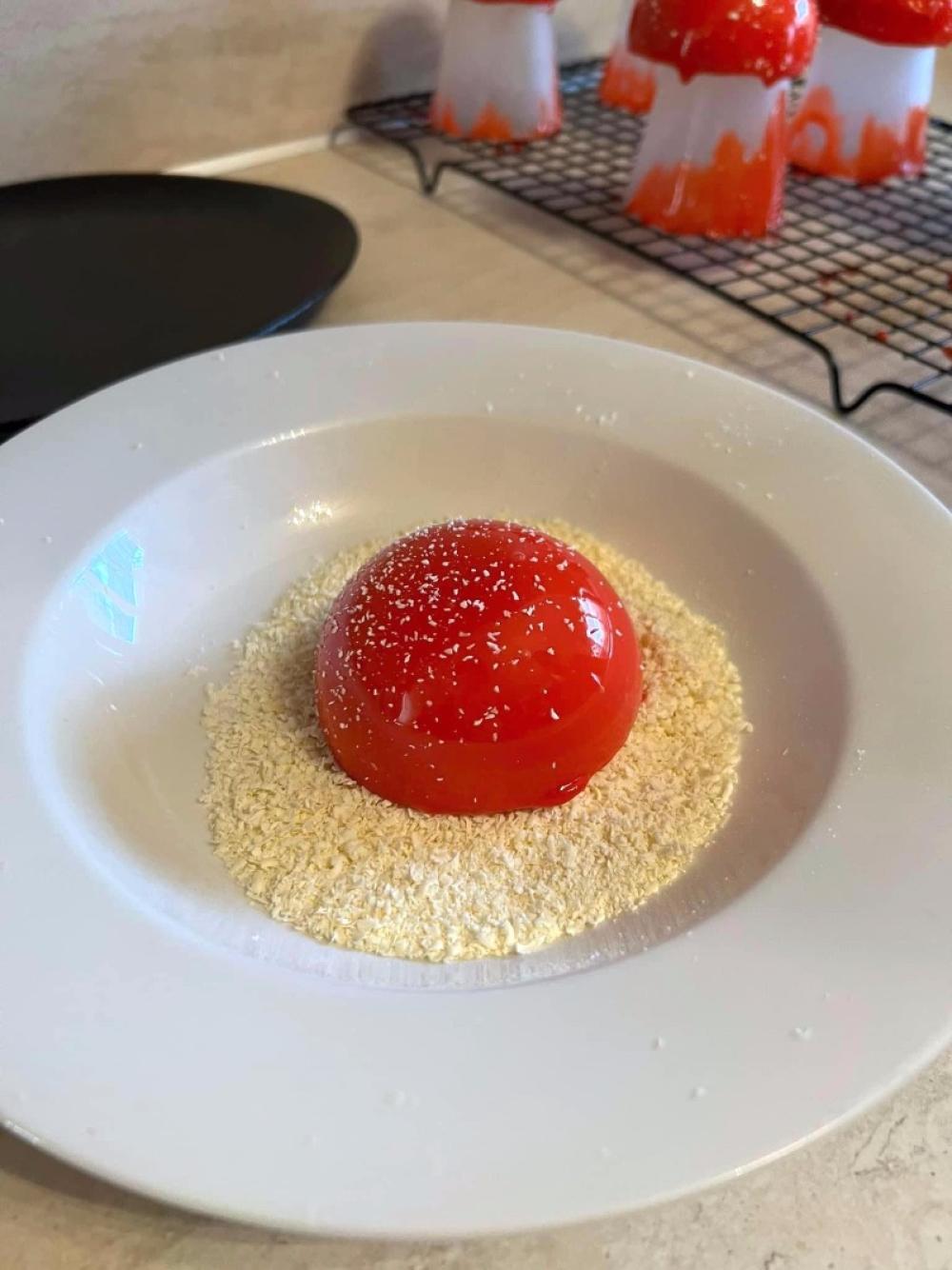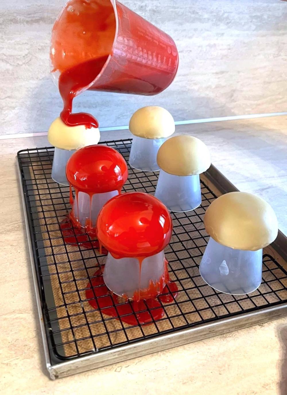 Na dan posluživanja, zagrijte smjesu čokolade i kakao maslaca te crvenu glazuru na 30-32°. Klobuke pečurki izvadite iz zamrzivača i izvadite iz kalupa.