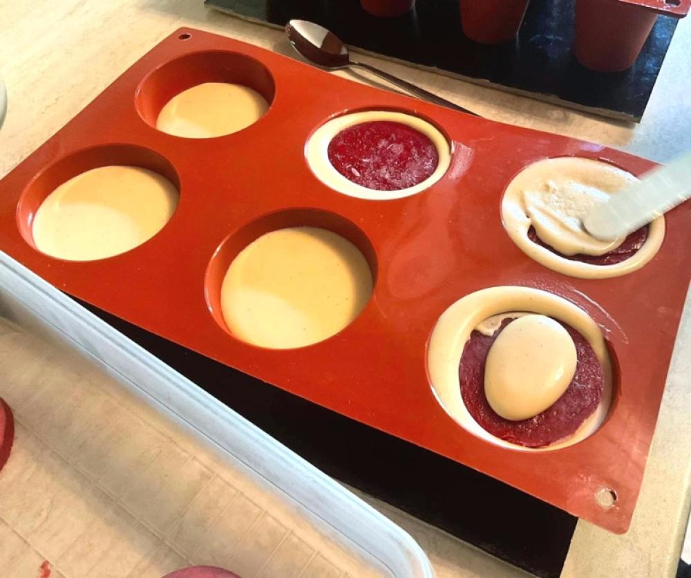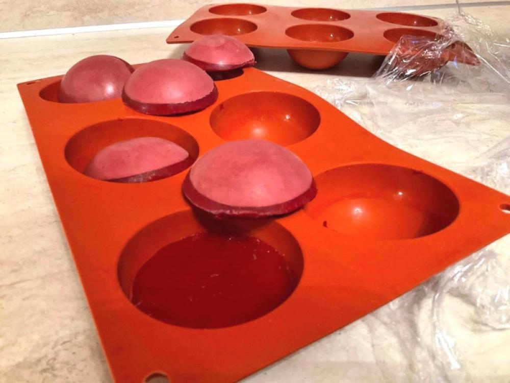 Mousse od bijele čokolade utisnite otprilike do polovice polu okruglog kalupa. Dodajte smrznuti sloj moussa od maline te stavite još dovoljno bijelog moussa da sve lijepo prekrijete. Prekrijte kalupe prozirnom folijom i zamrznite.