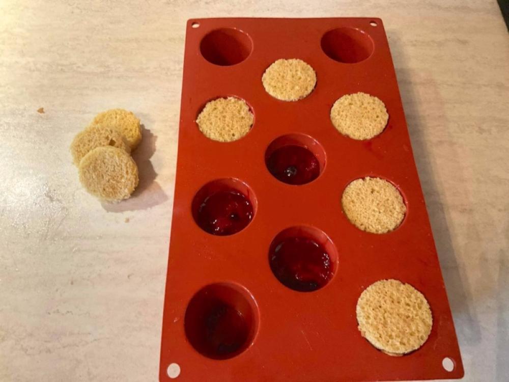 U zdjeli pomiješajte pire od malina i gustin da nema grudvica. U manji lonac stavite šumsko voće, limunov sok i šećer. Prokuvajte da malo smekša, a zatim dodajte prethodno pomiješani gustin i pire od malina, prokuvajte sve da se zgusne. Smjesu ulijte u manje inserte za stabljiku, kalupe popunite skoro do vrha, a zatim dodajte izrezane krugove biskvita. Prekrite folijom i stavite u zamrzivač.