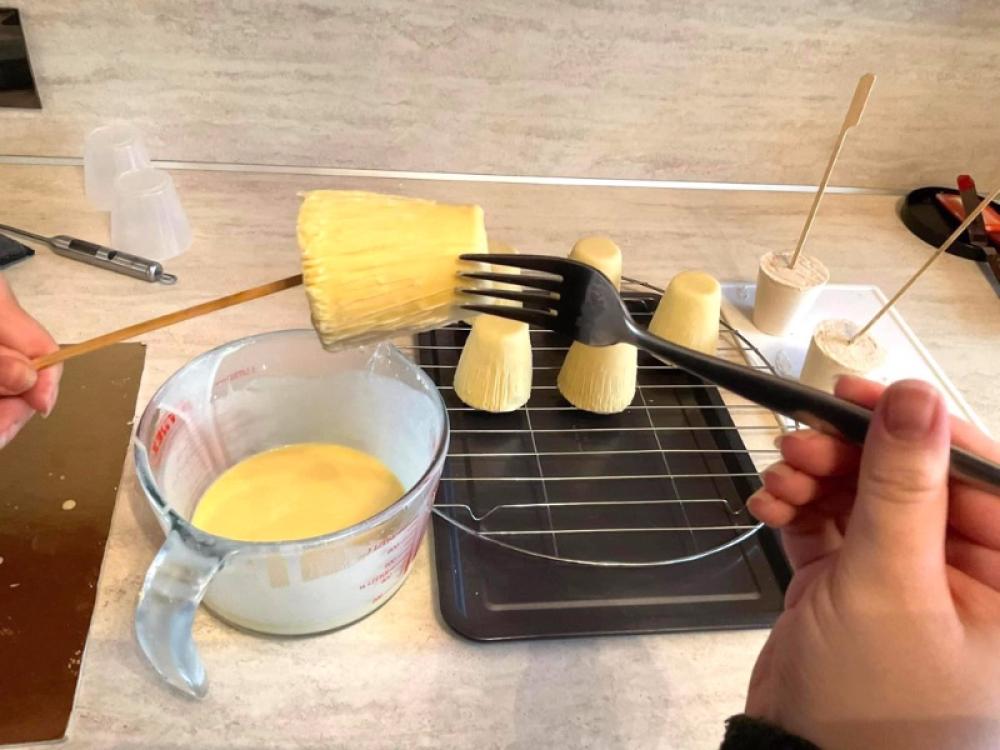 Stabljike pečuraka izvadite iz kalupa i u svaku zabodite štapić. Umočite ih u bijelu čokoladu jedan po jedan. Pomoću viljuške, ostružite dno stabljike i radite brzo jer se bijela glazura brzo stvrdne. Izvadite štapić i stavite na tanjir. Dno svake stabljike lagano premažite kakaom.