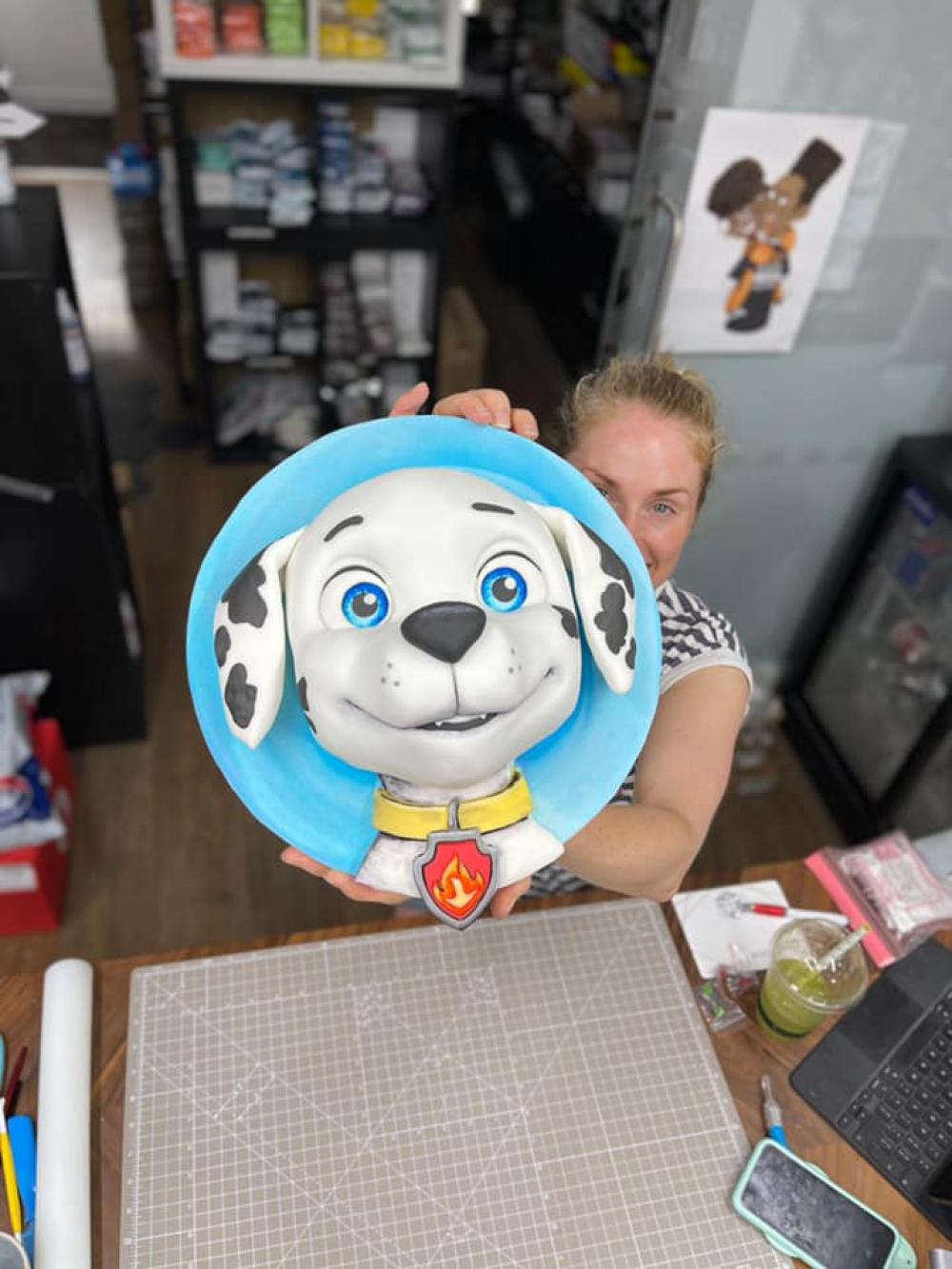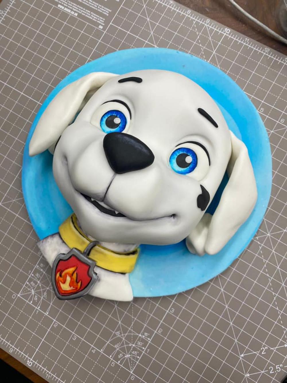 Izmodelujte od bijelog debljeg fondana Maršalov vrat. Od žutog fondana napravite traku za ogrlicu.