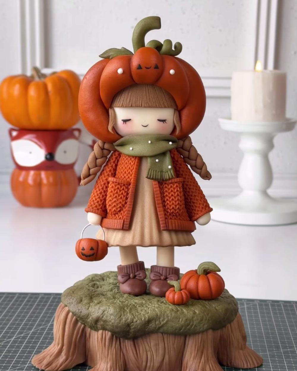 Ova slatka kreacija turske umjetnice Faribe Savari - Luscious.land, izrađena je od modeling mase, pažljivo oblikovana do najsitnijeg detalja – od pletenih pletenica i toplog džempera do minijaturne bundevice u ruci. Svaki element priča svoju priču, a rezultat je dekoracija koja oživljava svaku tortu i donosi osmijeh već na prvi pogled.