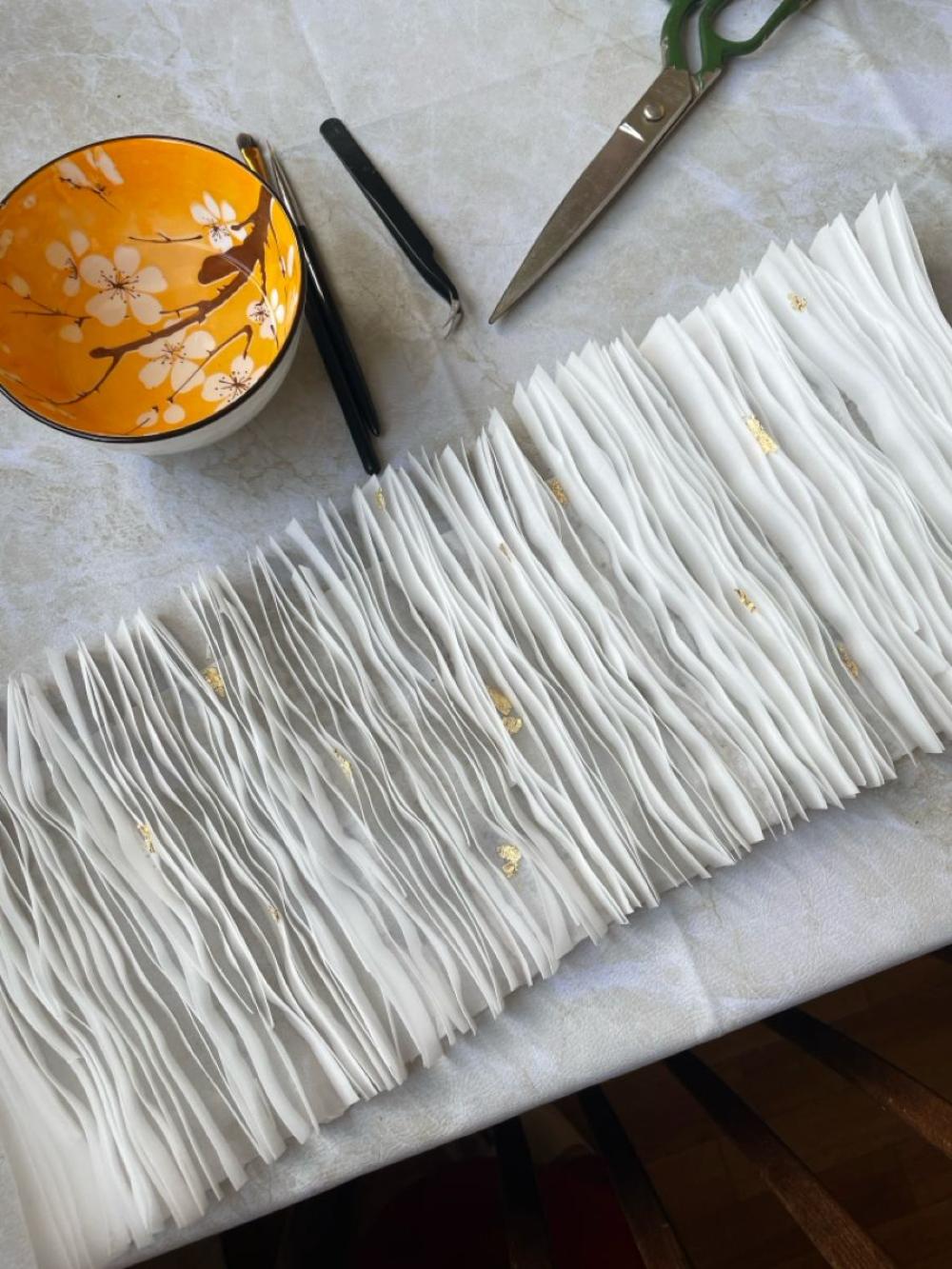 Za ovaj tip dekoracije koriste se trakice od debljeg vafer papira, jer tanji papir lako povuče vlagu i može se iskriviti- i trebalo bi nam barem trostruko više trakica...Za bržu izradu dekoracije, najbolje je staviti tri lista jedan na drugi i rezati ih skalpelom na čvrstoj podlozi kako bi ivice bile precizne.
