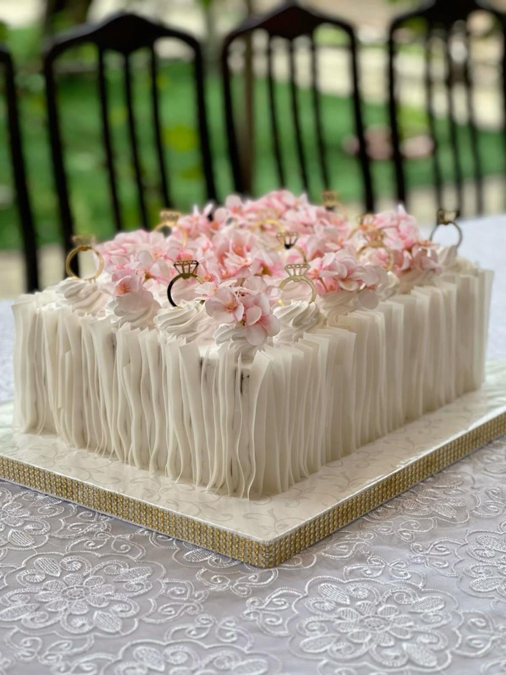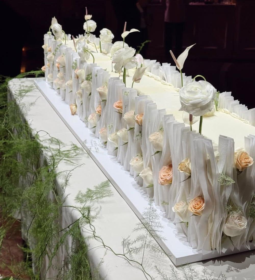 Umjesto slojeva koji idu u visinu, ovaj trend donosi tortu koja se prostire po dužini, često kao centralni ukras svadbenog stola. Oblijepljena puterkremom ili čvrsto umućenom slatkom pavlakom i ukrašena trakicama od vafer papira.
