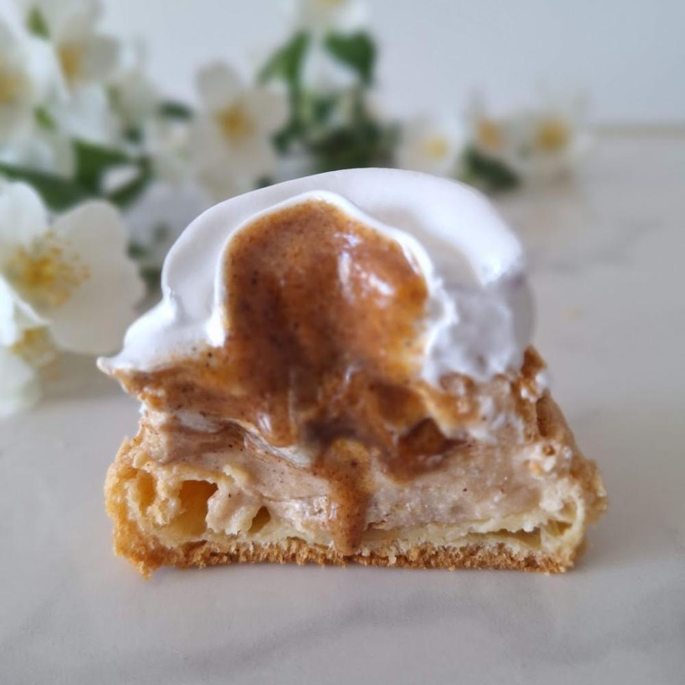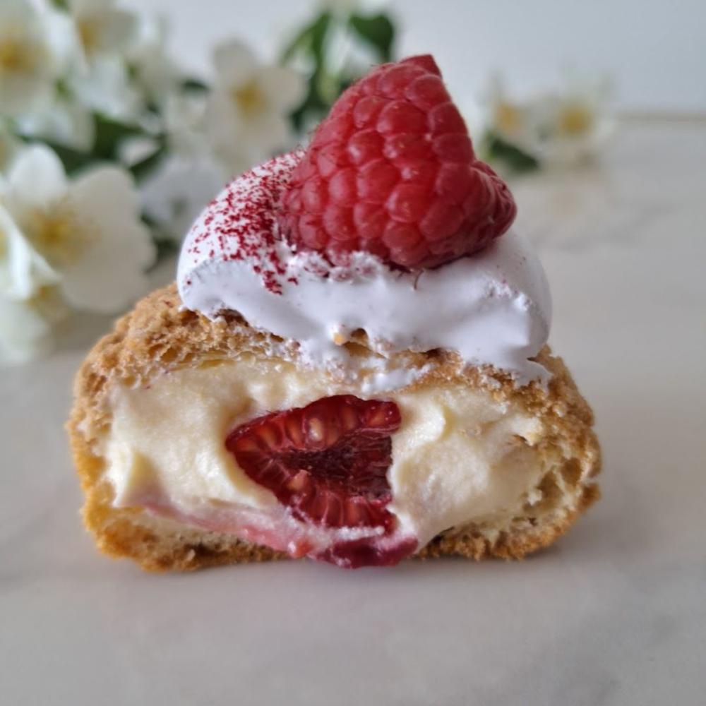 Craqueline napuniti kremom od vanilije. Po želji dodati u craquelin džemove od maline ili