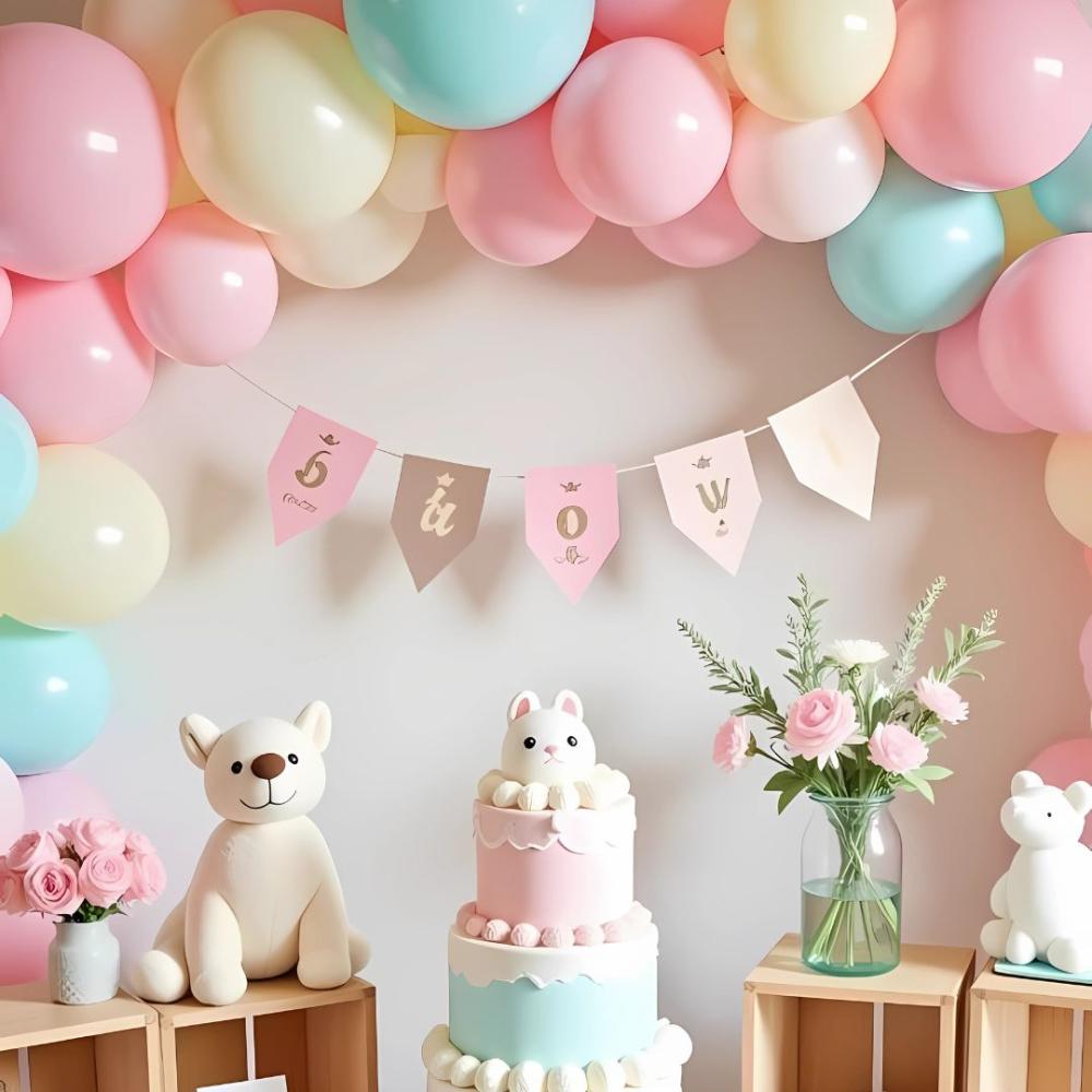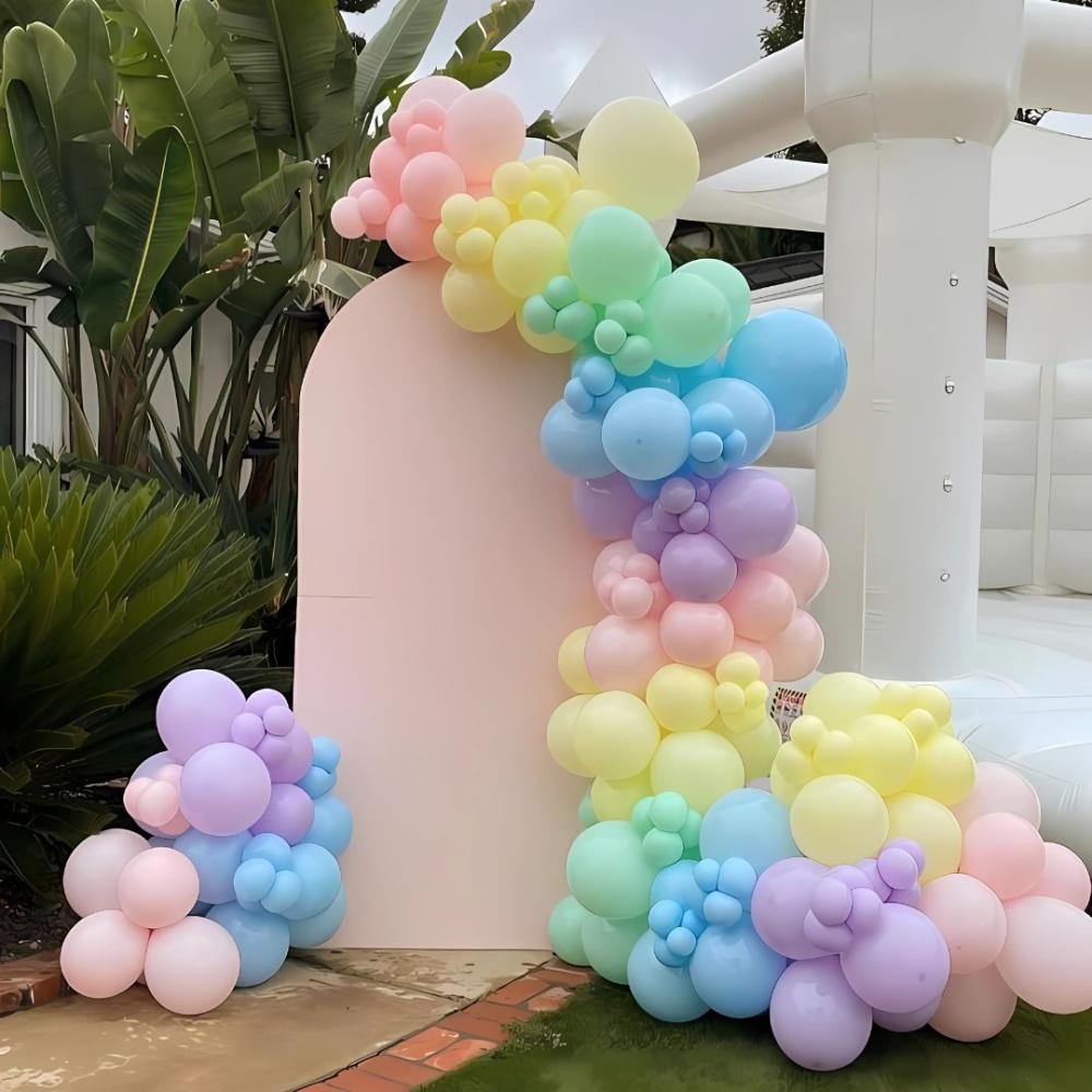 - Baloni u pastelnim bojama (ružičasta, žuta, kajsija, svijetlozelena, plava, lavanda). Kombinujte mini balone i standardne balone za 3D efekat