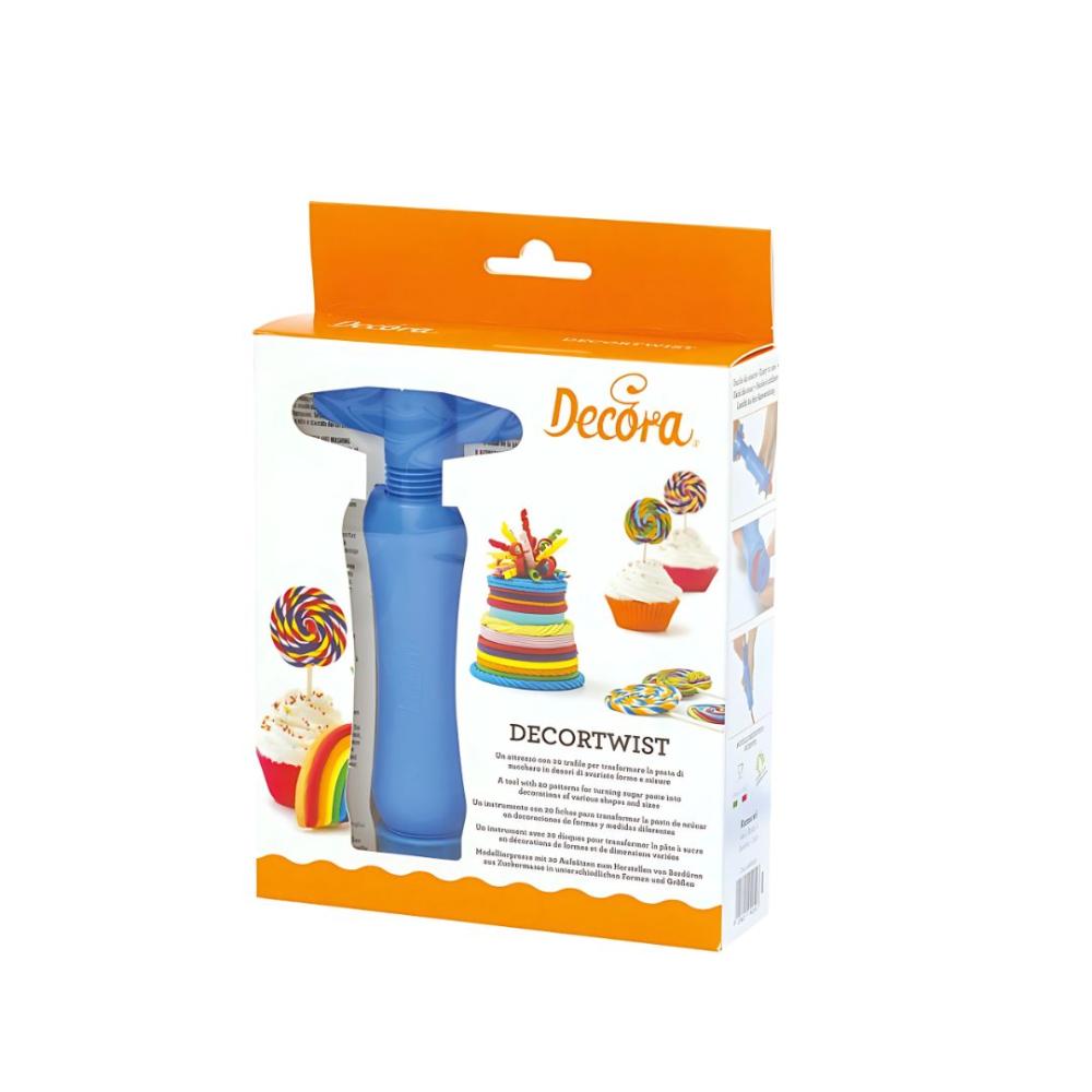 Ekstruder koji pretvara dekor pastu u niti različitih oblika i veličina, za ukrašavanje kolača i poslastica. Komplet uključuje 20 različitih promjenjivih matrica.
